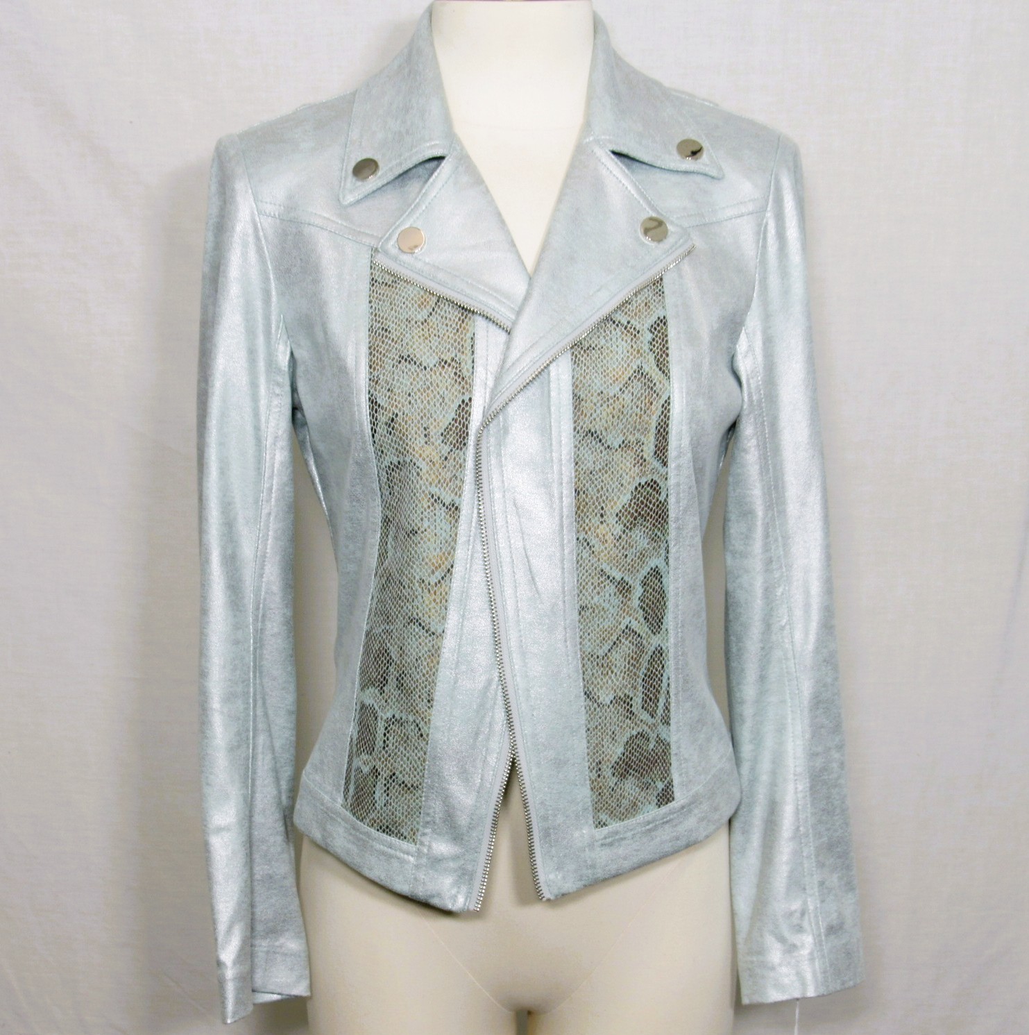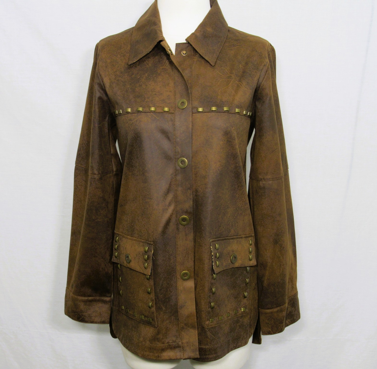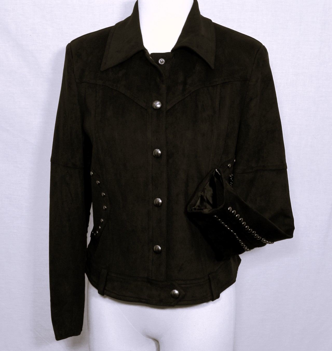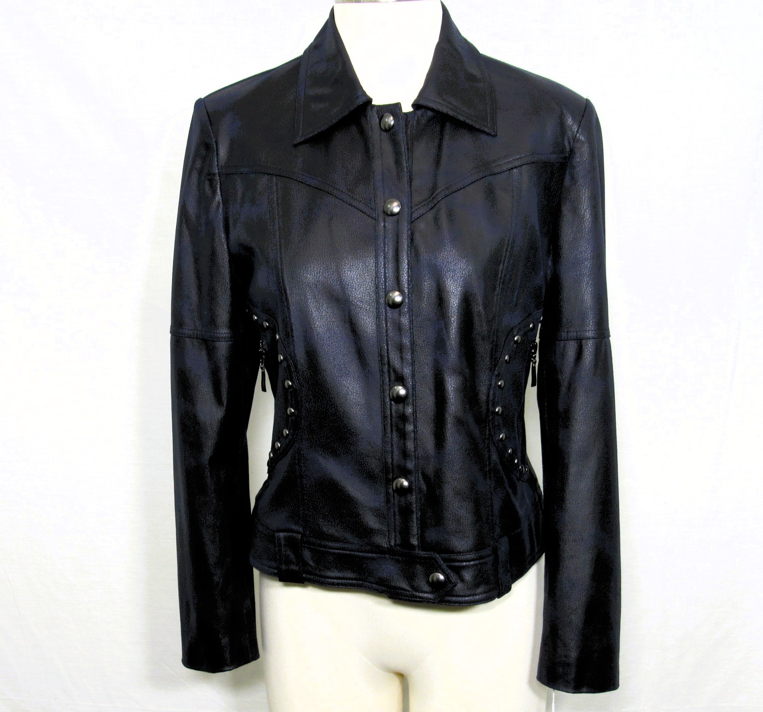 Fully Lined Embellished Long Sleeve Snap Front Vegan Leather Novelty Jacket by Inight New York;
