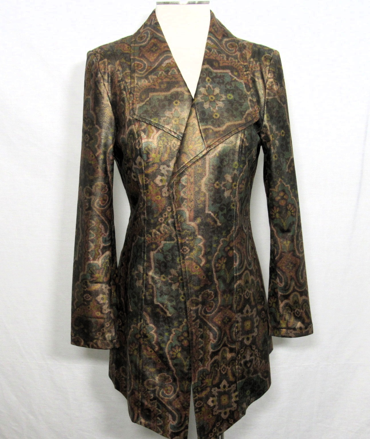 Long Sleeve Open Front Print Vegan Leather Novelty Jacket by Inight New York;