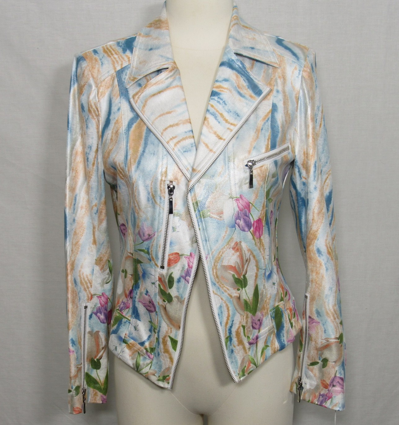 Embellished Long Sleeve Open Front Watercolor Print Vegan Leather Novelty Jacket by Inight New York;