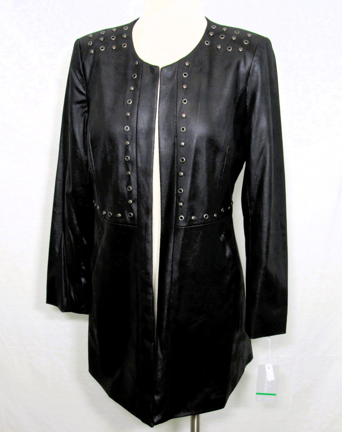 Fully Lined Embellished Long Sleeve Open Front Long Front Vegan Leather Novelty Jacket by Inight New York;