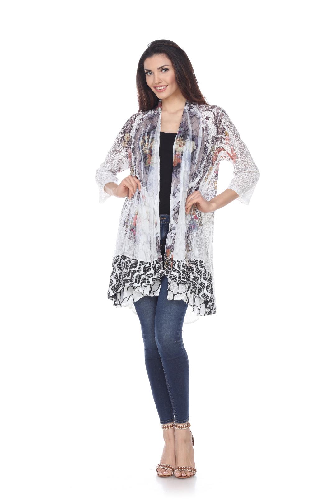 Short Sleeve Mixed Fabric Novelty Open Front Lace Cardigan by Kamana; Washable 80% Rayon/20% Polyester In White Multi Sizes S-M-L-XL(2-2-2-2)