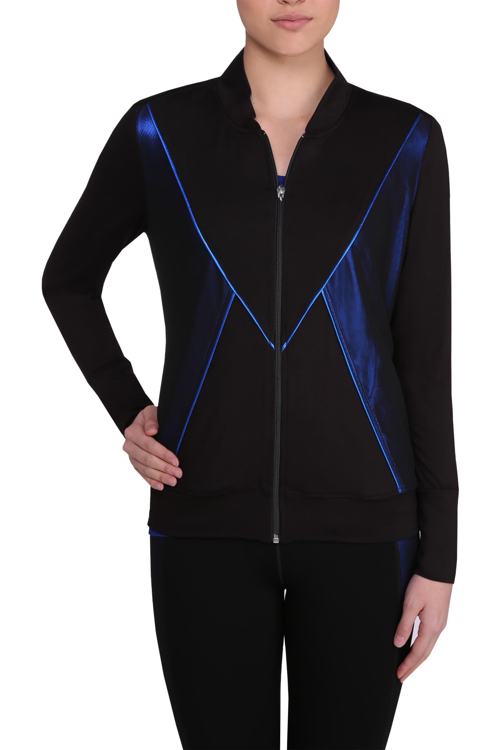 Fashion meets performance with this foil blocked jacket! This long sleeve can be used at the gym, or for an everyday casual-sporty look. This design has the styling's of a bomber jacket & features a zip front