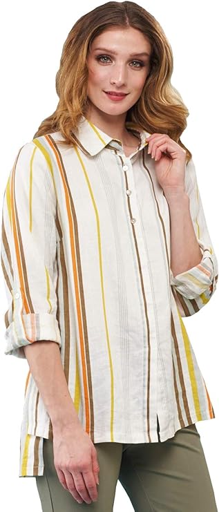 Roll Tab Sleeve Novelty Soft Linen Striped Blouse by Lena Gabrielle;