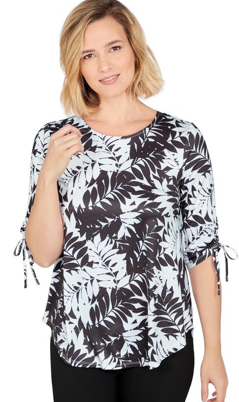 Meet The Casual Tie Top In Cool & Casual Palm Print. She Has A Scoop Neckline, Elbow Length, and Ruched Tie Sleeves.